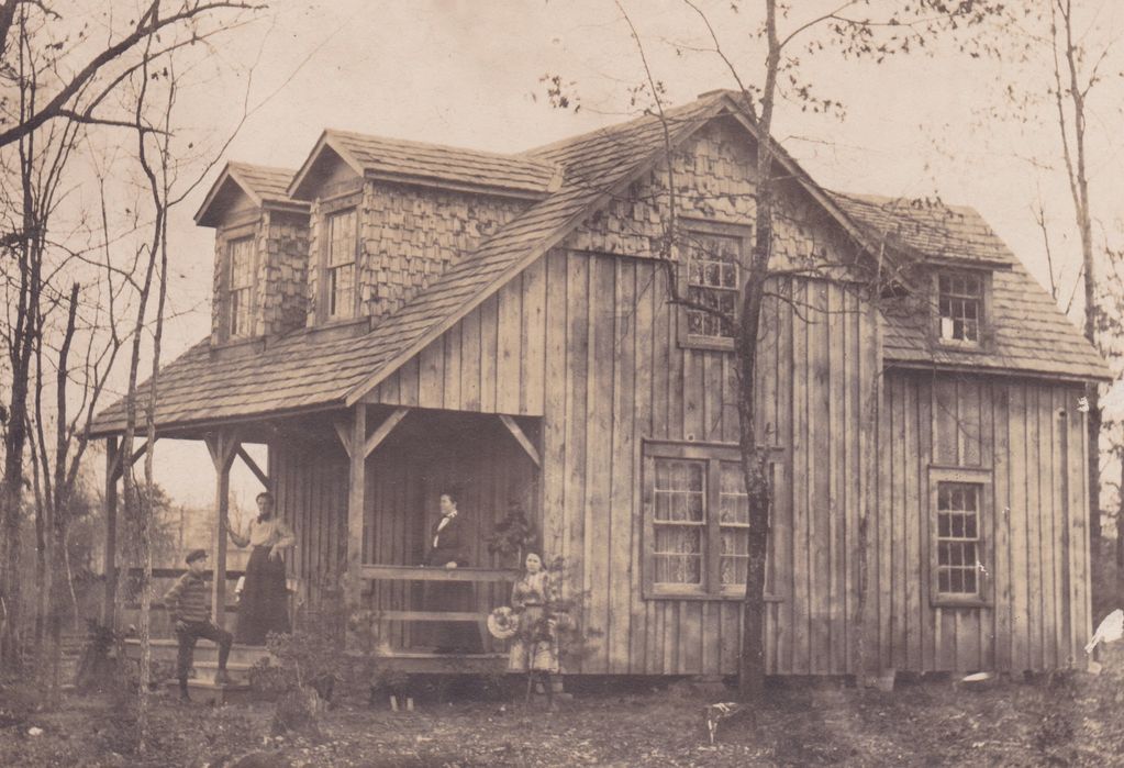 This photo, probably taken by Harriet Russell Stratton and printed from a glass negative, is identified as the first log home in the village of Piney Falls.