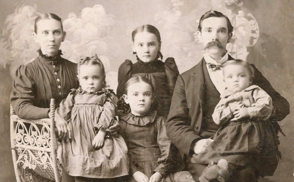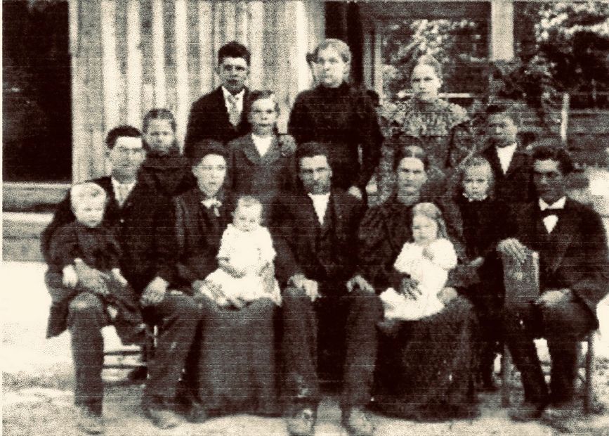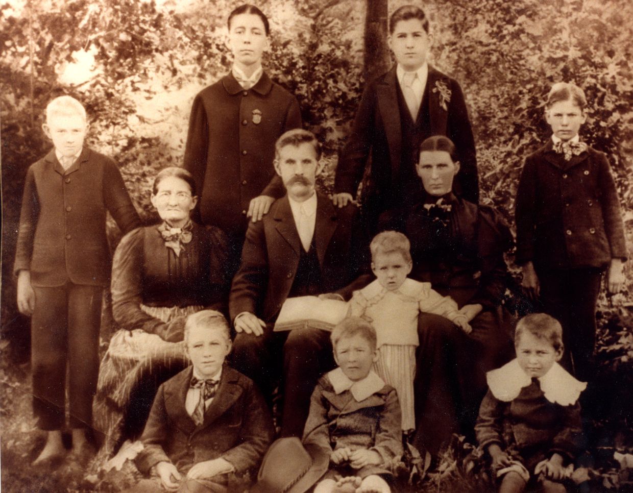 Sitting Front, L to R - Earnest Joseph Loy (siting on his father's lap), Joseph Yancey "Joel" Loy, Myra Jane Loy (wife of Joseph), Arthur William Loy (sitting on his mother's lap), John Leigue Allen Sr., Mary Catherine (Burnett) Allen, Ardella Mayrel Allen (sitting on her mother's lap - died one year later), Minnie Juanita (Allen) Richards (standing), Henry Mitchell Allen.