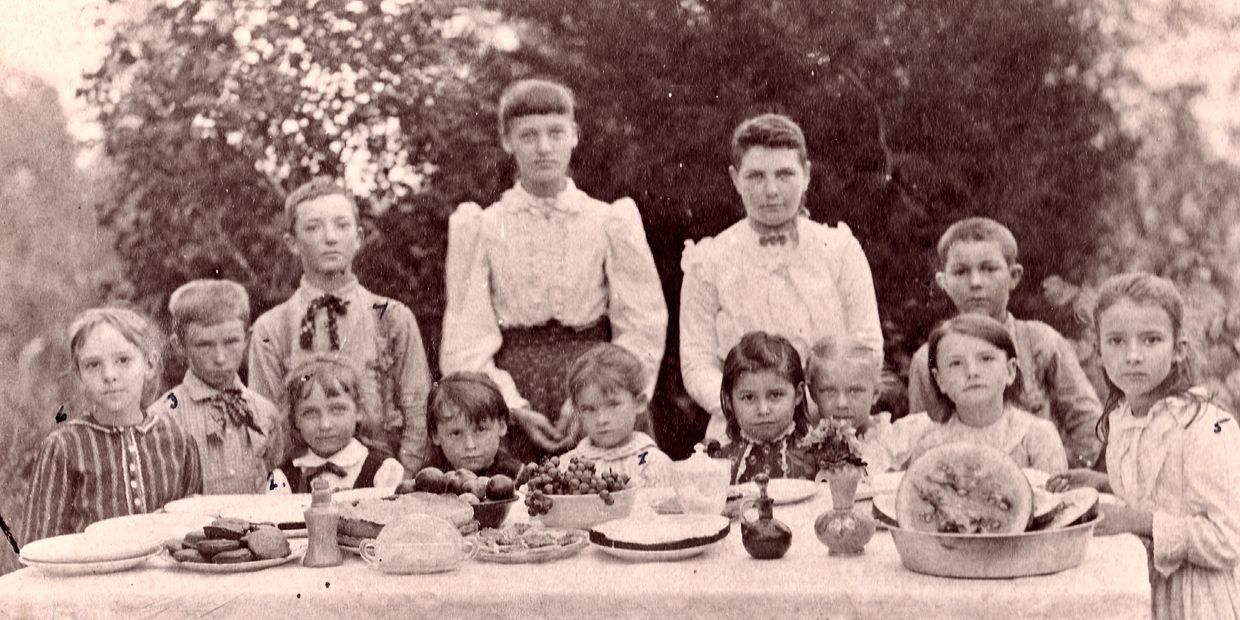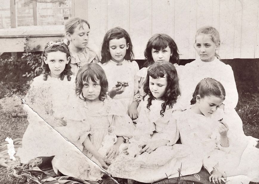 Children, L to R - Lena Stebbins, Charles Foster, Dora Dewey, Floyd Foster (back) , Unknown, Lucy Foster, Media Franklin, Unknown, Unknown, Unknown (back), Cora Franklin.