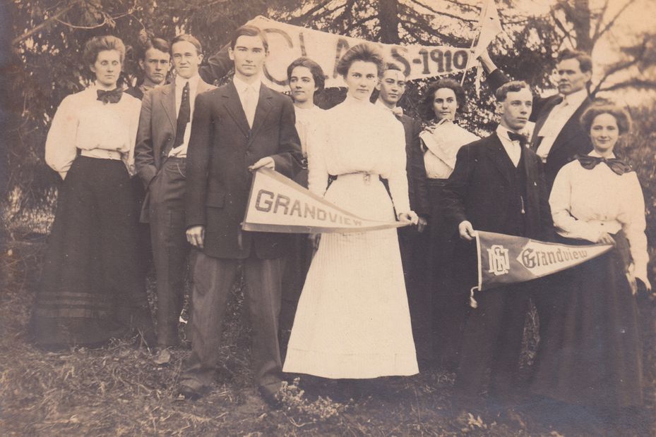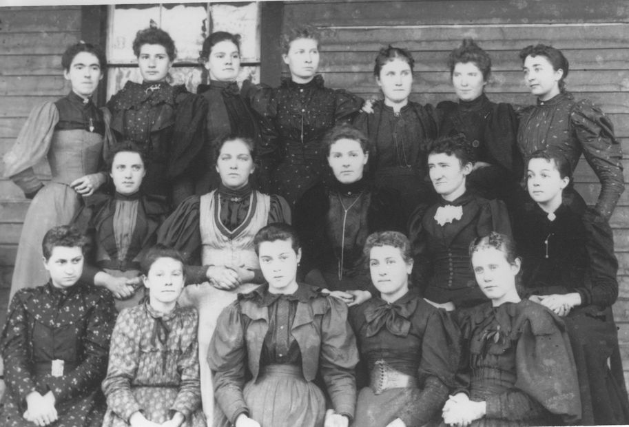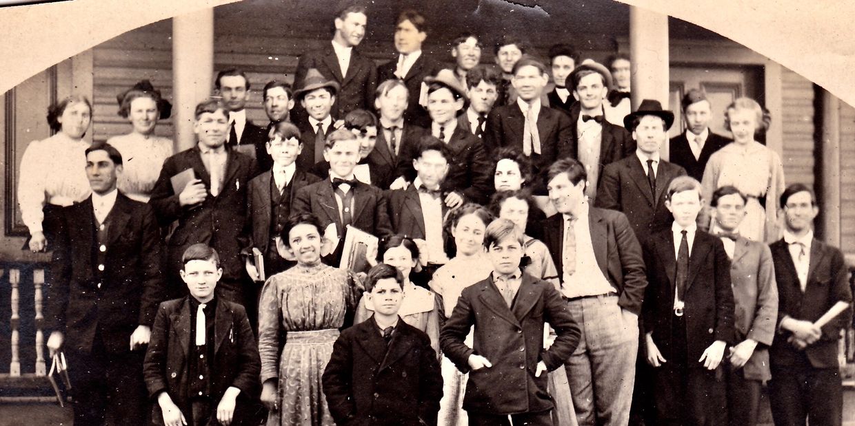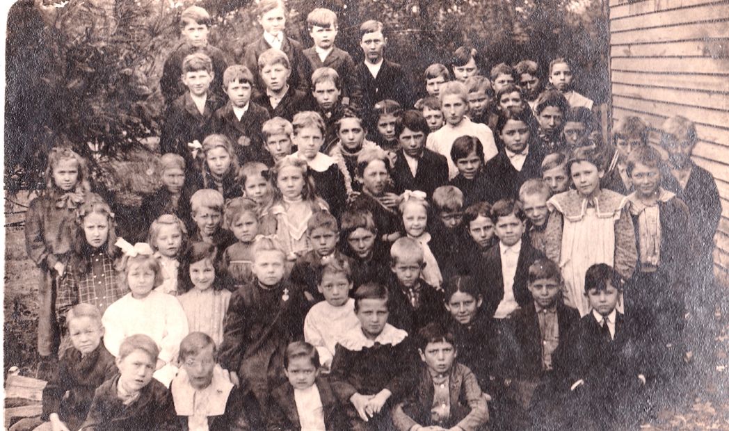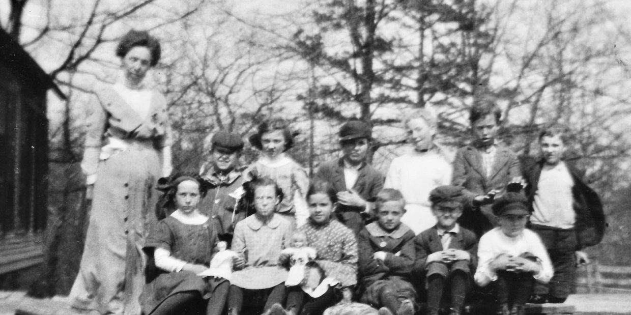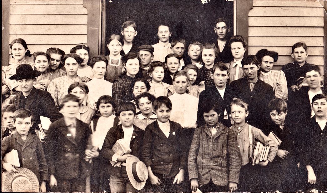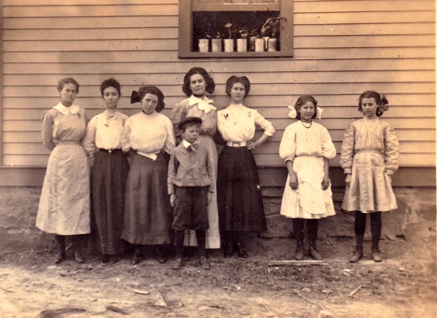 Miss Ellen Click, the teacher, is standing at enter at back of group. Olive Hinds is on front row wearing a chattered dress. The face of Lillie Hinds can be seen immediately to the right of Olive.