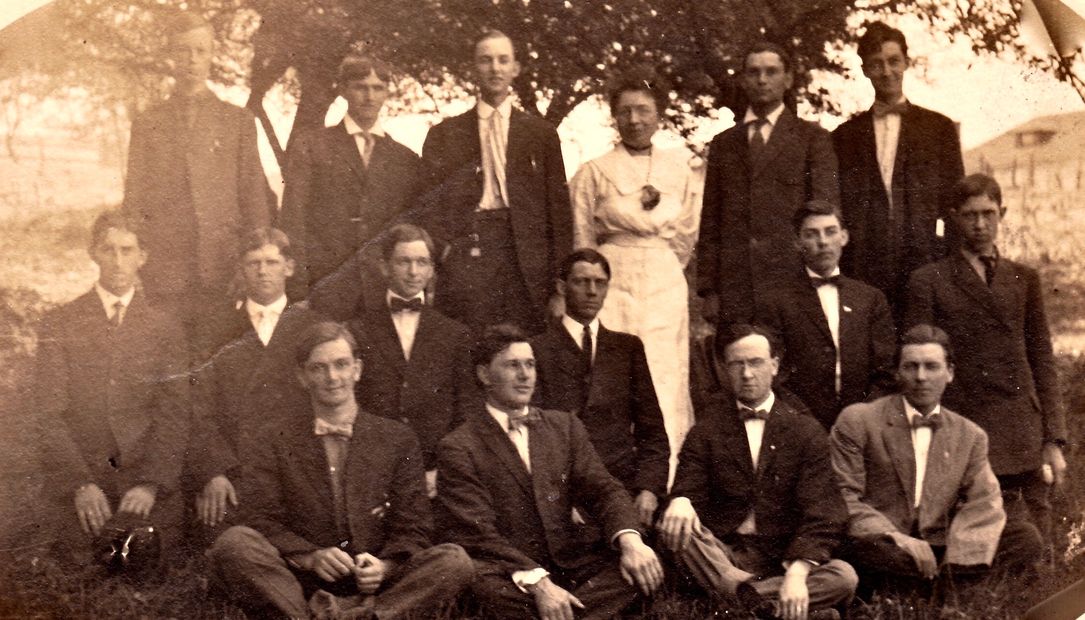 Standing, Back, L to R - Lee Garrett, James Kerley, Grover Ault, Mrs. Emma Woodworth (teacher), George Delaney (?), Aaron Swafford.